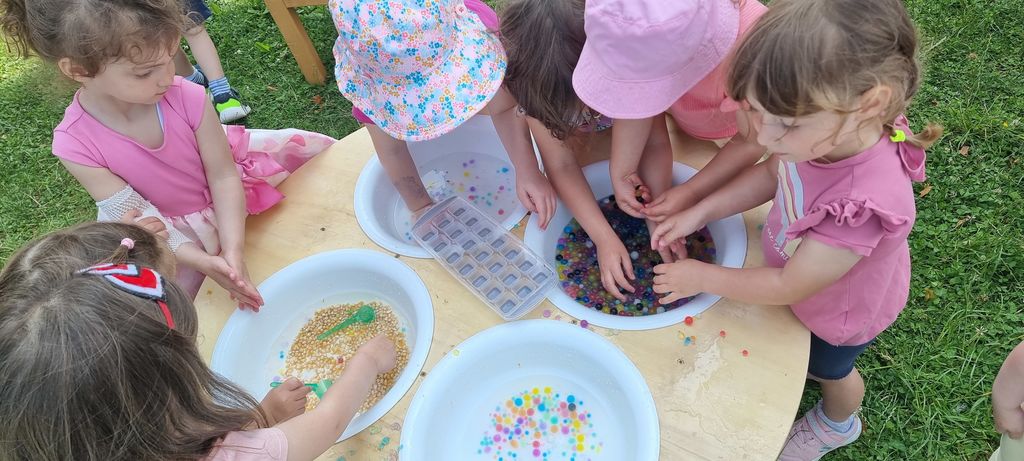 In potem še otrokom najljubša delavnica – igra z vodo, koruzo in gel kroglicami. Mešanje, pretakanje, stiskanje in ... da, tudi malo polivanja. Ampak nič za to – senzorna izkušnja brez mokrih rok ni prava izkušnja!