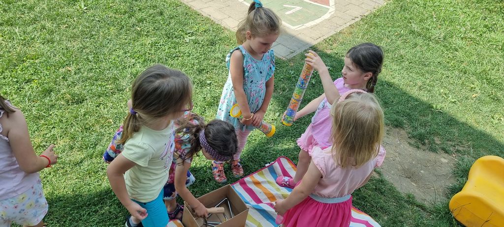 Glasbeni kotiček: Otroci uživajo ob ritmu glasbe, sploh če le-tega ustvarjajo sami. Lepo jih je bilo poslušati, ko so igrali in peli v objemu narave.