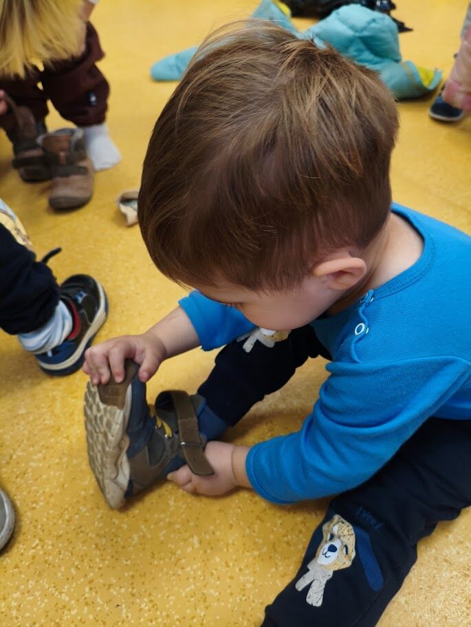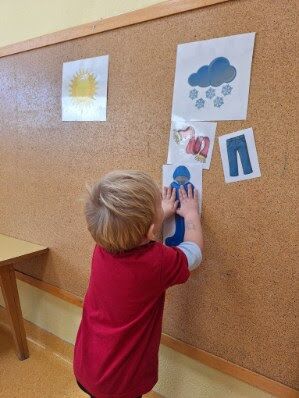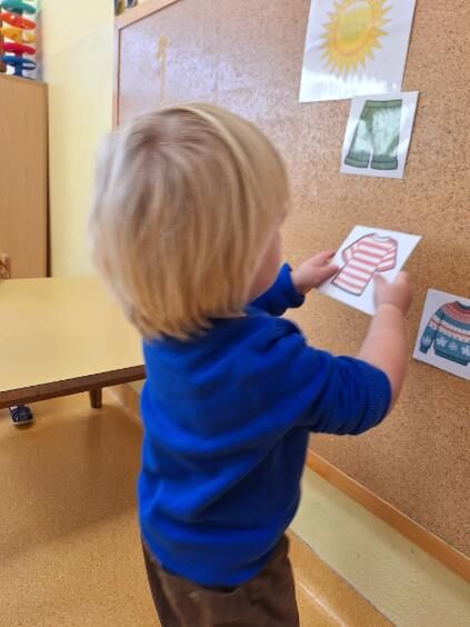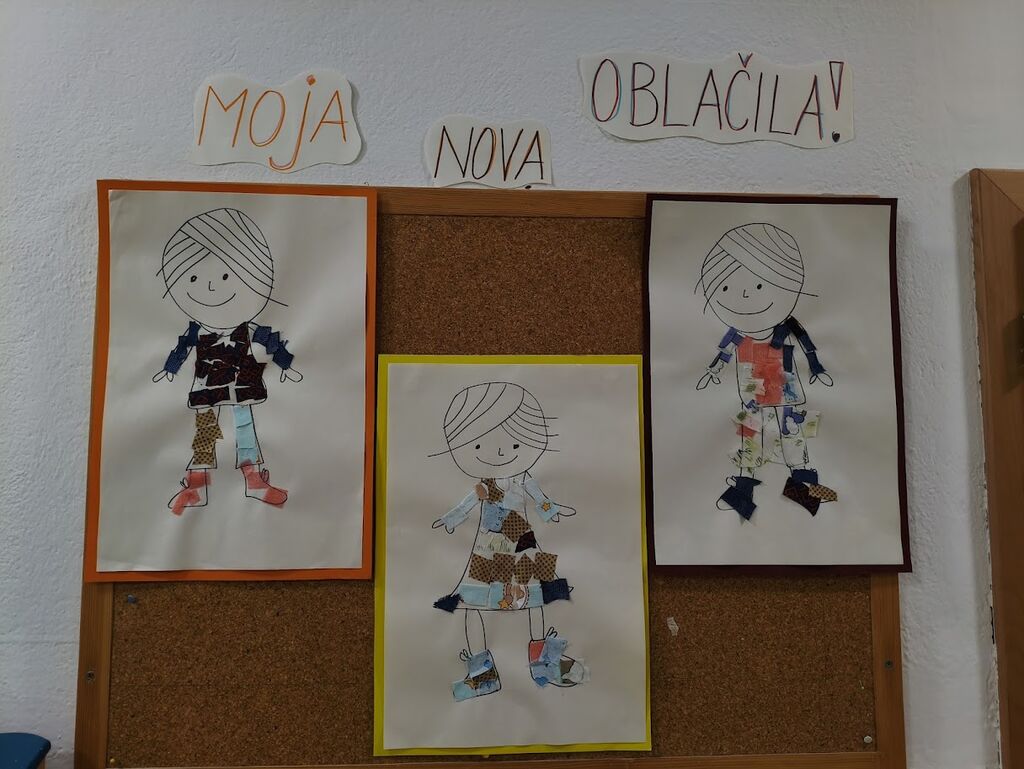 Oblačila in obutev so otroci razvrščali glede na vreme. Posamezna oblačila in obutev so poimenovali (pulover, kratke hlače, škornje) in spoznali, kdaj glede na vreme je potrebno katero tudi obleči. Za okrasitev igralnice in garderobe pa je vsak otrok »oblekel« svojega fantka ali punčko. To so otroci storili tako, da so narezane koščke blaga nalepili na ustrezen del oblačila na punčki ali fantku. Pri tem so otroci razvijali orientacijo in pojem zgoraj, spodaj.