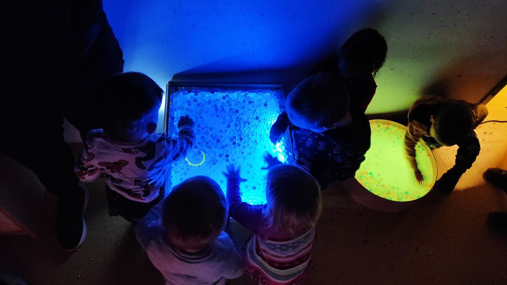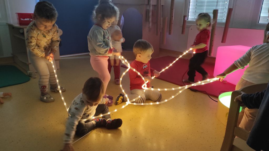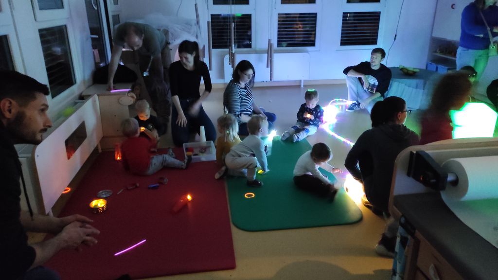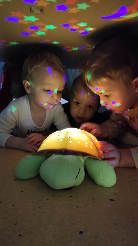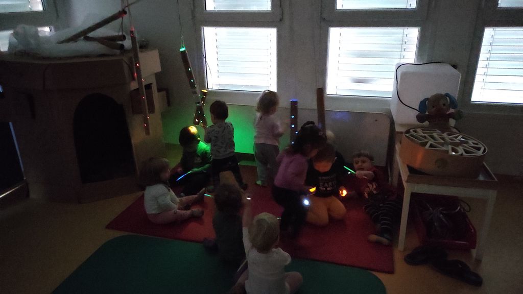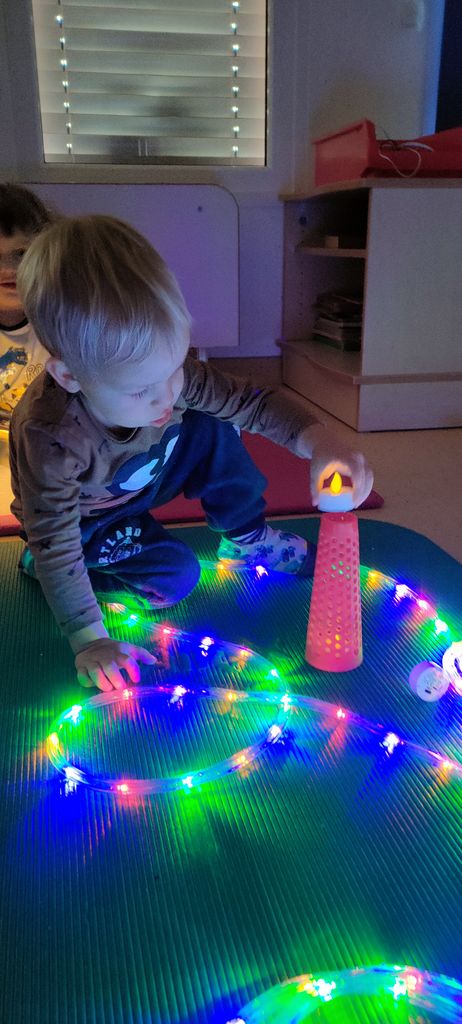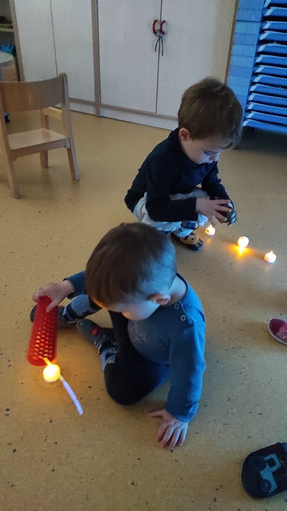 Pokazali smo jim, kako se zjutraj pozdravimo s pesmijo in zaplesali Ringa raja. Skupaj smo raziskovali, kaj se zgodi, če na svetlobno mizo stresemo »gel kroglice«, se igrali s svečkami na baterije ter svetilkami, ki smo jih pokrivali z različnimi predmeti, gledali zvezdno »nebo« pod mizo, ki ga je projicirala nočna lučka, se skrivali v zimski hiški z lučkami in opazovali svetlobno verigo.