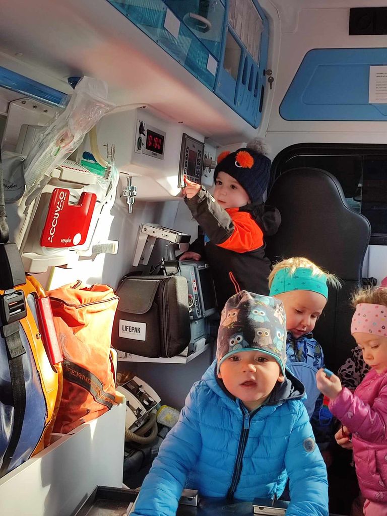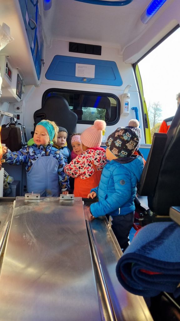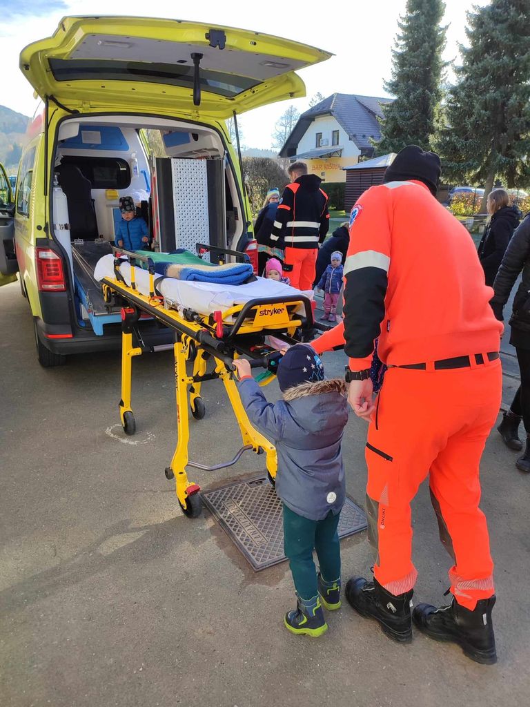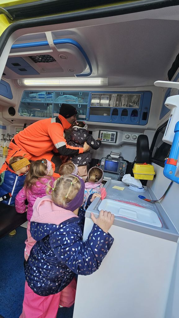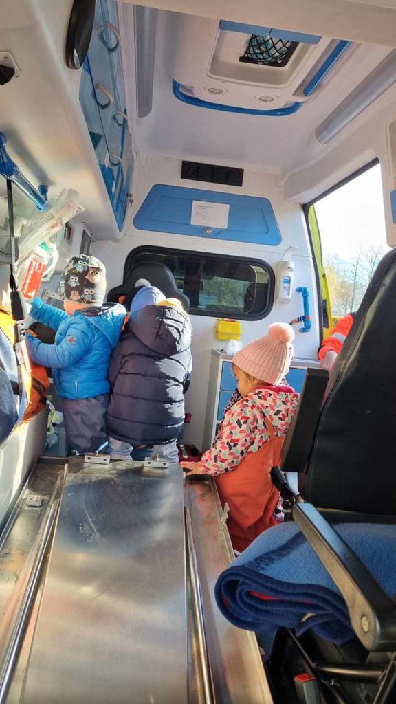 Bili smo veseli, da se ni nič hudega zgodilo, obiskali so nas reševalci iz ZD Tržič. Ekipa predanih in nasmejanih reševalcev je otrokom predstavila delo reševalca in reševalno vozilo. Pokukali smo v njihove reševalne torbe, si pobliže ogledali vozilo in njegovo notranjost ter pripomočke. Najpogumnejši so dovolili, da jih privežejo na posteljo na kolesih, tako kot v primeru nujne vožnje, in naložijo v reševalno vozilo. Za konec je reševalec prižgal intervencijske luči in sireno, ki je bila tako glasna, da so si otroci hiteli zatiskati ušesa. Hvala reševalcem ZD Tržič za poučen obisk.