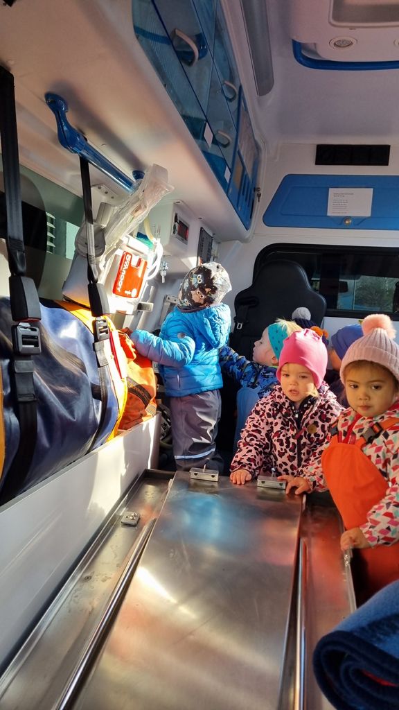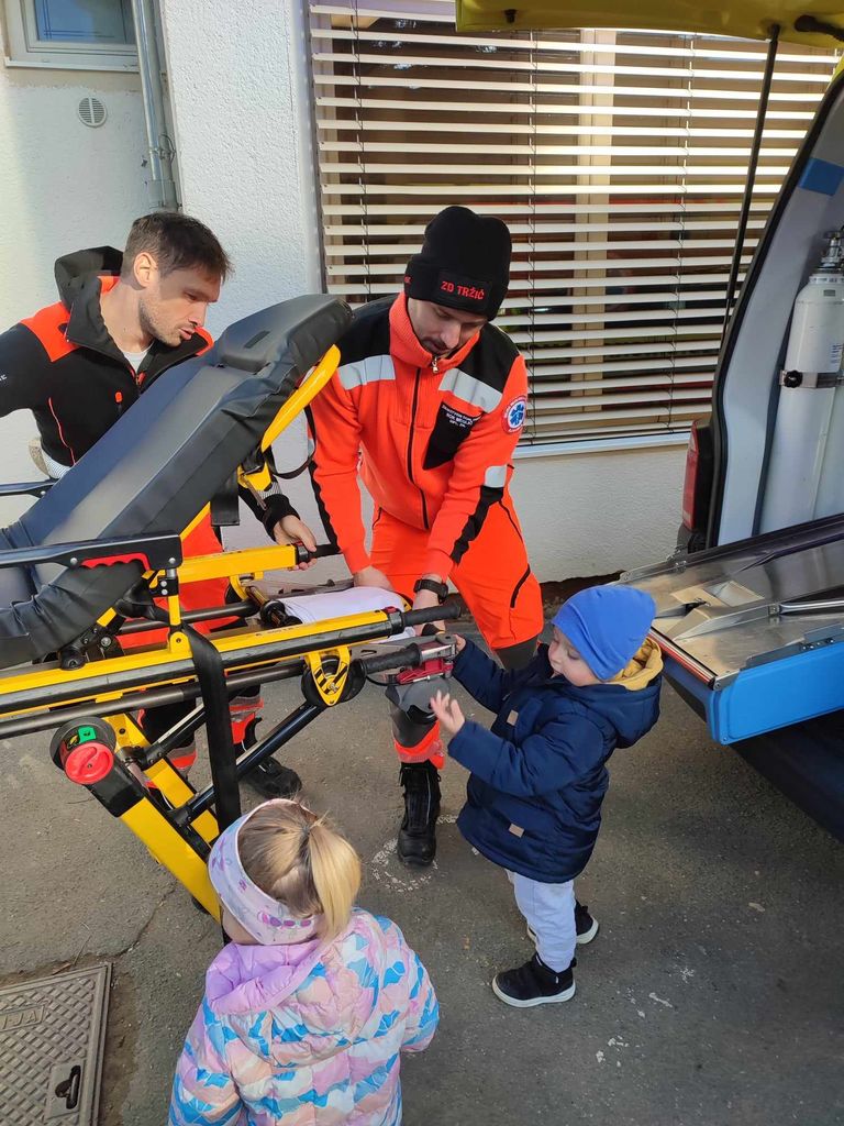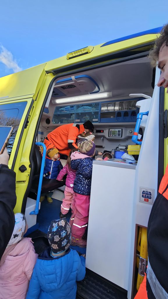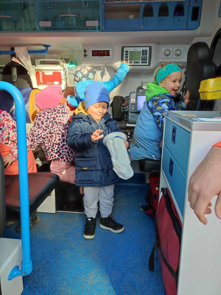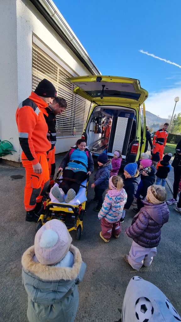 Bili smo veseli, da se ni nič hudega zgodilo, obiskali so nas reševalci iz ZD Tržič. Ekipa predanih in nasmejanih reševalcev je otrokom predstavila delo reševalca in reševalno vozilo. Pokukali smo v njihove reševalne torbe, si pobliže ogledali vozilo in njegovo notranjost ter pripomočke. Najpogumnejši so dovolili, da jih privežejo na posteljo na kolesih, tako kot v primeru nujne vožnje, in naložijo v reševalno vozilo. Za konec je reševalec prižgal intervencijske luči in sireno, ki je bila tako glasna, da so si otroci hiteli zatiskati ušesa. Hvala reševalcem ZD Tržič za poučen obisk.