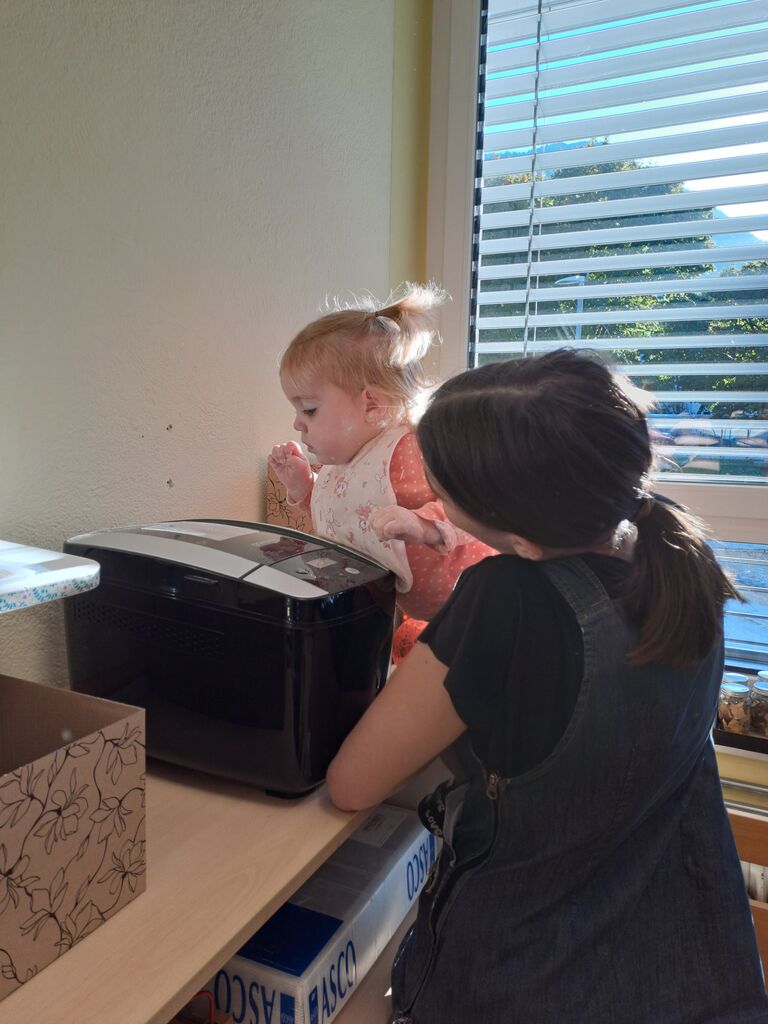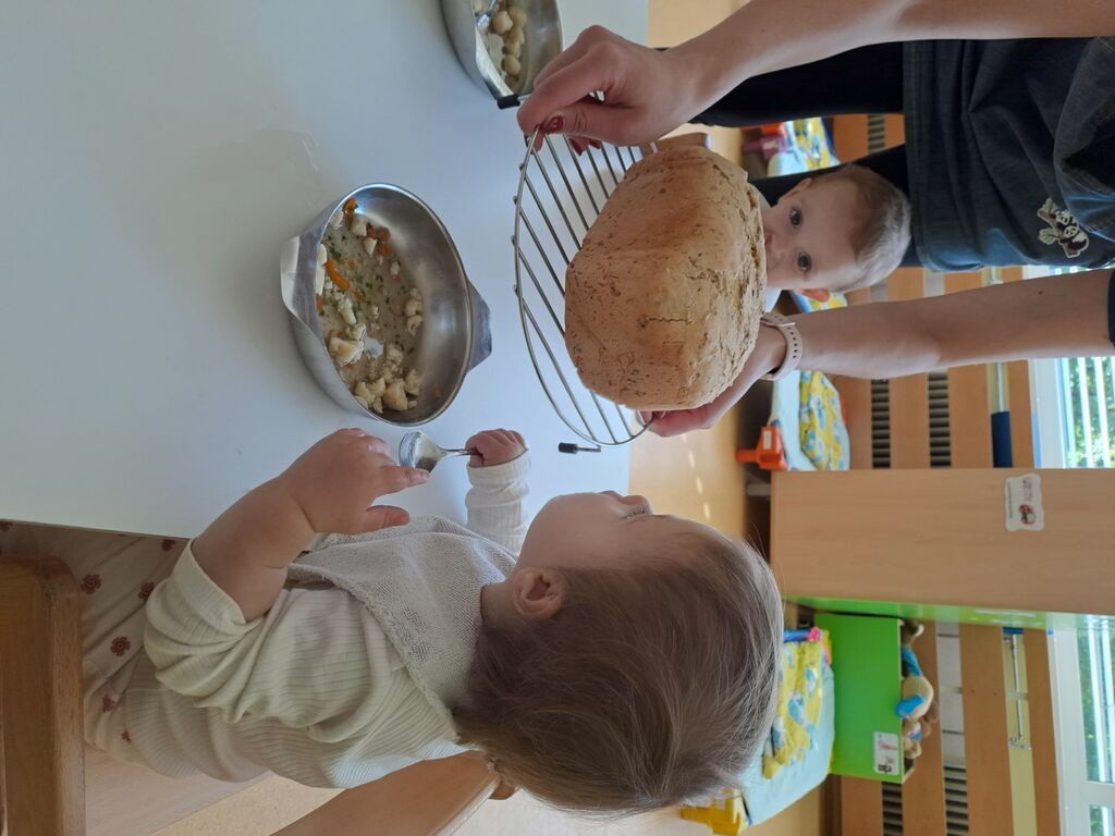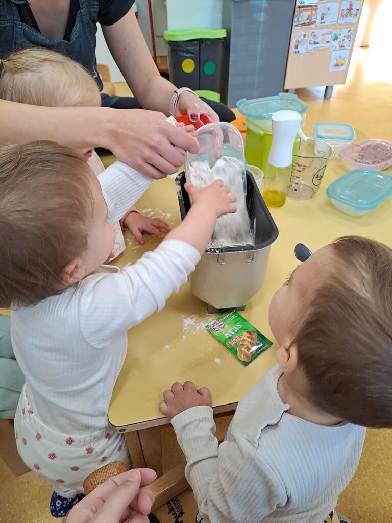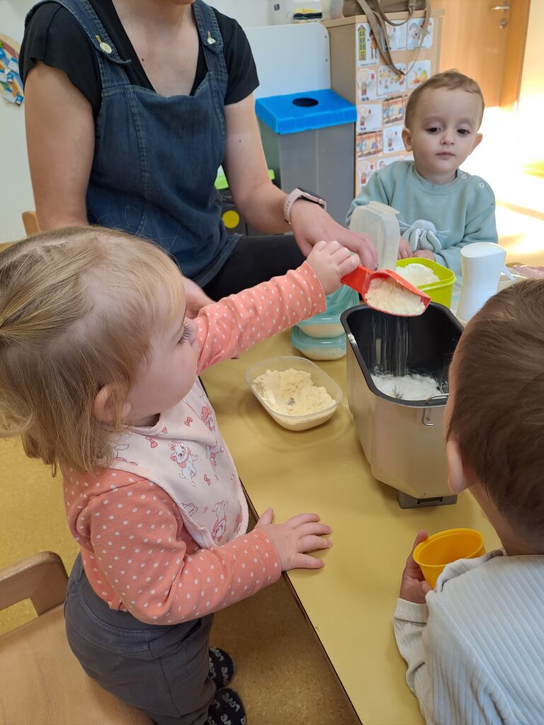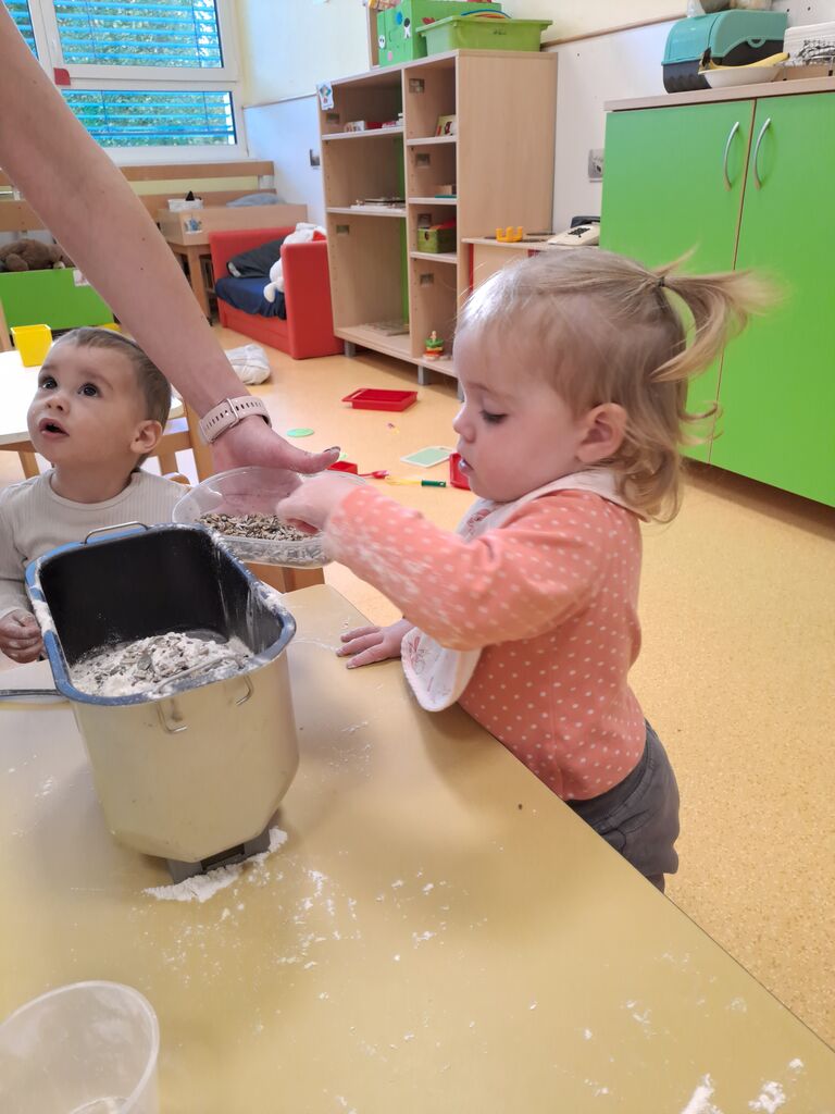 Mizo smo s prtom pogrnili, nanj smo kup stvari zložili. Imeli smo več vrst moke, malo kvasa, soli in vode . Vmes smo še semena dodali, in počasi smo mali peki postali. Vzgojiteljica nam je pridno pomagala, da je vse sestavine v kruhomat, mala roka dala. Nato smo zanimivi aparat v tišini opazovali, in komaj smo na naš kruh čakali. Vmes smo šli na malo svežega zraka, in pri kosilu, nas je že vonj po kruhu pričakal.
