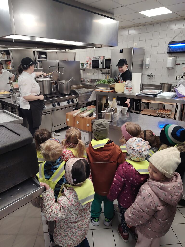 Že ob prihodu nas je toplo sprejela gospa Sandra Preradović. Povedala nam je, da nas bo ona vodila skozi njihovo kuhinjo in restavracijo in čutiti je bilo prav prijetno vzdušje. Najprej nas je popeljala skozi njihovo kuhinjo, tako smo videli, kako izgleda prava kuhinja v restavracijah in gostilnah, kjer pripravljajo slastne jedi. Otroci so z zanimanjem opazovali, kako poteka delo kuharjev, in spoznali, kdo je za kaj zadolžen. Izvedeli smo, da je ena kuharica odgovorna za pripravo solat, glavni kuhar vodi delo v kuhinji, druga kuharica mu pomaga in sprejema naročila strank po telefonu. Pokazali so nam različne lonce, posode, kuhinjske pripomočke, pečico, veliko kuhalnico in zajemalko, pečico za pico in še veliko druge opreme, ki jo uporabljajo pri svojem delu. Pokukali smo tudi v skladišče, kjer hranijo živila, in spoznali, kako skrbno morajo biti sestavine shranjene. Izvedeli smo tudi, kako pomembna za kuhinjo sta red in čistoča.