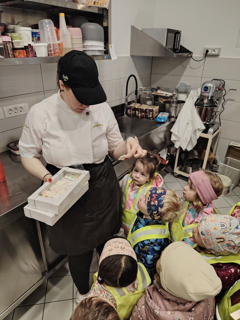 Posebno navdušenje je požel prostor, kjer Sandra ustvarja okusne sladice. Pokazala nam je različne pripomočke, ki jih pri tem uporablja, kot so mešalnika, tehtnica, modelčke za peko, lopatico ... in različne okraske, s katerimi na koncu svoje sladice lepo in ustvarjalno okrasi. Vse pripravljene sladice pospravi v vitrino, ki stoji v restavraciji pri »šanku« (točilnem pultu), kjer so na hladnem in hkrati na ogled gostom.