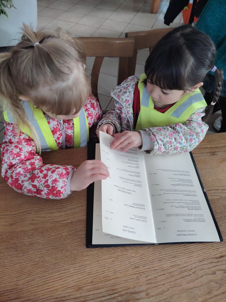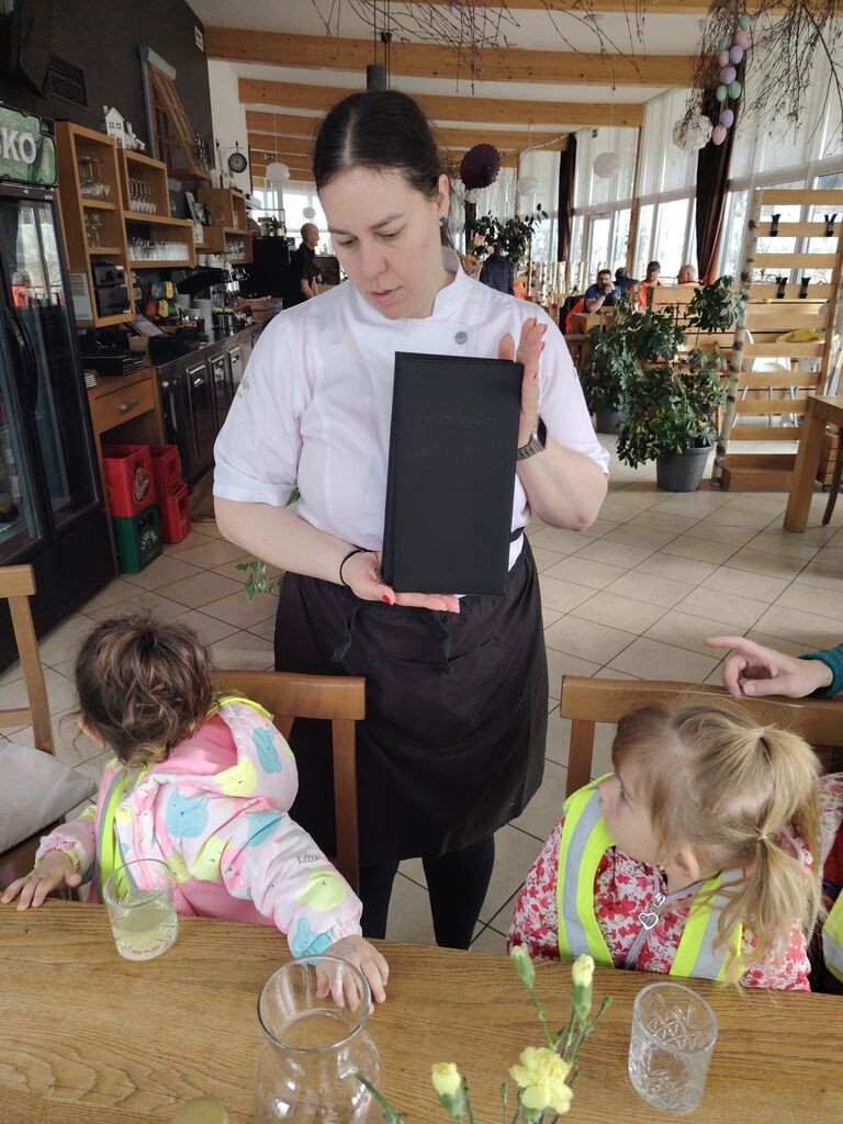 Za konec so nam pripravili lepo pogrnjene mize, za katere smo se posedli kot pravi gostje, kjer nas je Sandra prijazno postregla s Cedevito in vodo, ob čemer smo se počutili še posebej pomembne. Nato je otrokom na razumljiv in strokoven, a hkrati zabaven način razložila še osnove bontona v restavraciji - kako se primerno in mirno vedemo, ne vpijemo, ne tekamo po prostoru, ne motimo drugih gostov ter poslušamo starše – in jih spodbudila, da sami povedo svoje ideje o primernem vedenju, pri čemer so otroci z veseljem sodelovali in naštevali, da se vedemo lepo, ne skačemo, se ne tepemo, ne kričimo, upoštevamo pravila ... Sandra jim je nato predstavila tudi jedilni list, razložila, kaj vse vsebuje, ter ga razdelila med otroke, da so si ga lahko ogledali v parih, kar je hitro preraslo v živahno in navdušeno razpravo o tem, kaj bi jedli in pili ter kako bodo sem pripeljali svoje starše na pico ali kakšno drugo dobro jed. Otroci so se ob tem zabavali, njihovi obrazi pa so bili polni zadovoljstva, radovednosti, novih idej in pristnega navdušenja, kar je ustvarilo prijetno, sproščeno in hkrati poučno vzdušje.