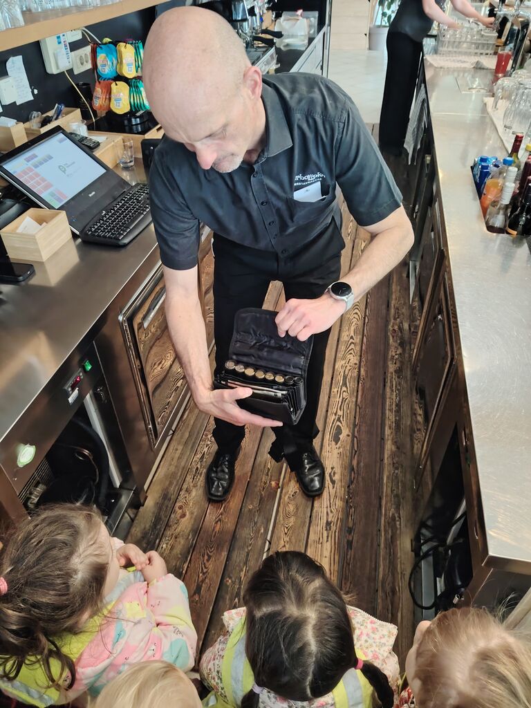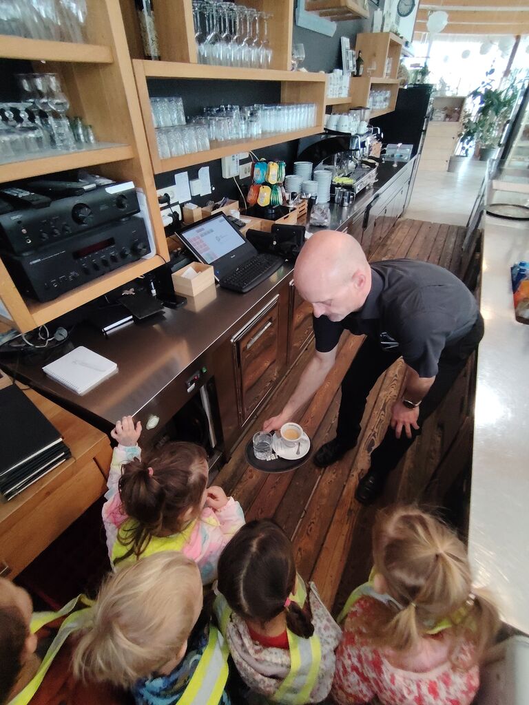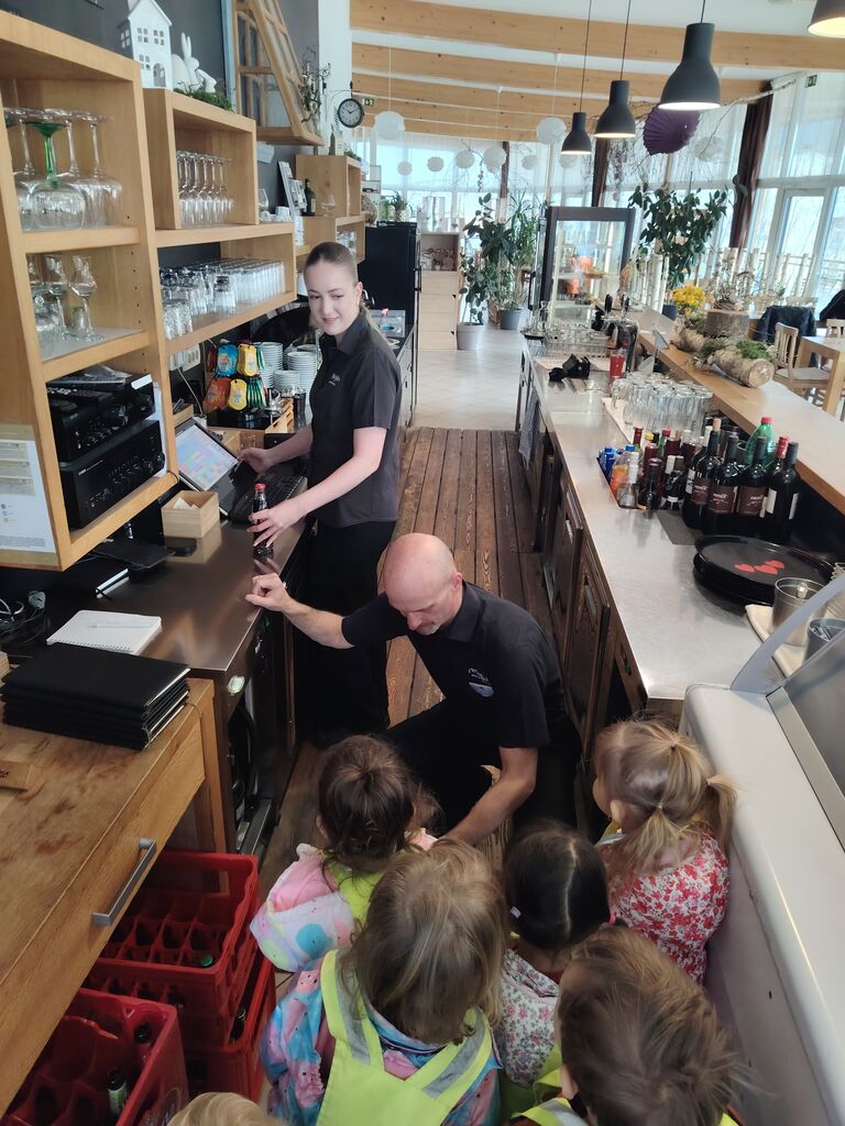 V restavracijskem delu smo spoznali še delo natakarja. Najprej smo samo od daleč opazovali, kako natakar sprejema goste, prevzame naročilo, ga posreduje kuhinji in, ko je jed pripravljena, postreže goste. Nato se nam je gospod Jani pridružil in nam na razumljiv in prijeten, a strokoven način predstavil svoj poklic oziroma svoje delo, ki vključuje sprejemanje in strežbo gostov, svetovanje pri izbiri jedi in pijače, skrb za urejenost miz, nemoten potek strežbe, prijazno komunikacijo, hitro in natančno delo ter skrbi za dobro počutje gostov. Goste po obrokih vedno z nasmehom in vljudno vpraša, ali je bilo vse v redu, saj mu je pomembno, da gostje odidejo zadovoljni. Kasneje nam je pokazal, kako se kuha in pravilno postreže kava, kako poteka delo z blagajno ter celo razložil, kaj vsebuje natakarjeva »denarnica«. Otroci so izvedeli, kje shranjujejo pijačo, katero vino mora biti na hladnem, katero na sobni temperaturi, kakšni kozarci se uporabljajo za določeno pijačo in kako tesno je povezano delo med kuhinjo in strežbo – pravo timsko delo!