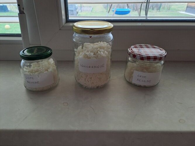 Z otroki sem se usedla v naš jutranji krog, kot to naredimo običajno. Vprašala sem jih, ali so se že kdaj pogovarjali z rižem. Začeli so se smejati. Pa sem jih vprašala, ali bi se radi pogovarjali z rižem, v naši igralnici. Vsi otroci so se navdušeno strinjali. V kuhinji smo prosili kuharje, da nam skuhajo riž, ki smo ga potem enakomerno porazdelili v tri prazne kozarce. Na en kozarec smo napisali grde besede, na drugega lepe besede, na tretjega pa smo zapisali besedo ignoriranje. Nato je vsak izmed otrok povedal eno lepo in eno grdo besedo. Tretji kozarec smo ignorirali, in ga dali na okensko polico. Tak postopek smo v jutranjem krogu izvajali vsak dan, dokler nismo opazili prvih sprememb. Po skoraj 14 dneh našega poskusa je kozarec, na katerem je pisalo ignoriranje, začel plesneti. Otroci so bili nad tem presenečeni. Preostala kozarca nista imela nobenih sprememb. Po končanem enem mesecu smo poskus v oddelku zaključili. Rezultati so ostali enaki kot po 14 dneh poskusa.