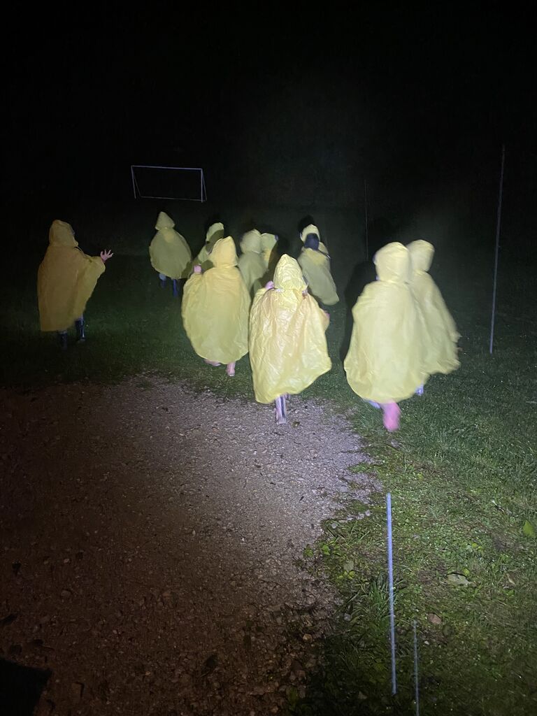 Večer smo preživeli aktivno – razmigali smo se skozi gibalne igre in ples. Ko je zunaj postalo temno, smo se odpravili na nočni sprehod z ročnimi svetilkami. Med sprehodom smo bili zelo pozorni na okolico in opazili smo kar nekaj zanimivih stvari – žabo na cesti, močerada ter pajkovo mrežo pri vrtni hiši. Ko smo se vrnili v vrtec, smo se udobno namestili in zaključili večer s pravljico. Otroci so zadovoljni in nasmejani zaspali – polni lepih doživetij.