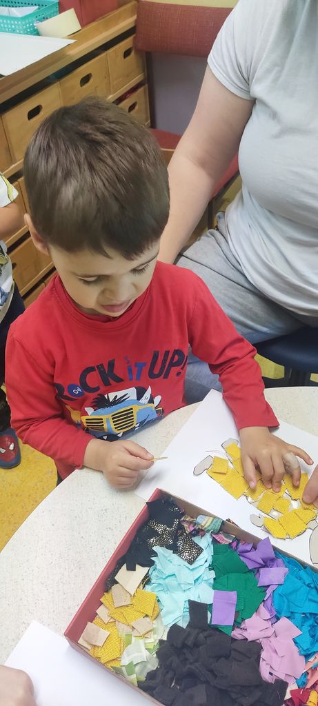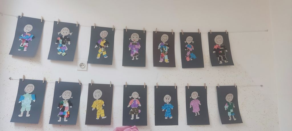 V nadaljevanju projekta je vsak izmed otrok sam »oblekel« svojega dečka ali deklico, in sicer tako, da je na izrezano silhueto nalepil raznobarvne koščke blaga. Pisano oblečeni dečki in deklice so nam polepšali igralnico in garderobo.