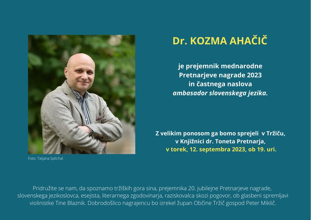 Dr. KOZMA AHAČIČ je prejemnik mednarodne Pretnarjeve nagrade 2023 in častnega naslova ambasador slovenskega jezika.