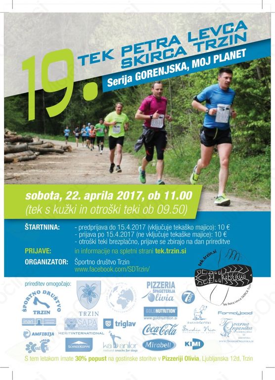 19. Tek Petra Levca Trzin, sobota, 22. aprila 2017, ob 11.00 uri. Tek s kužki in otroški tek ob 9.50.