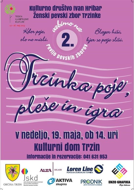 Kulturno društvo Ivan Hribar Ženski pevski zbor Trzinke vabi na 2. revijo pevskih zborov: TRZINKA POJE, PLEŠE in IGRA, v nedeljo, 19. maja 2019, ob 14. uri, v Kulturnem domu Trzin!