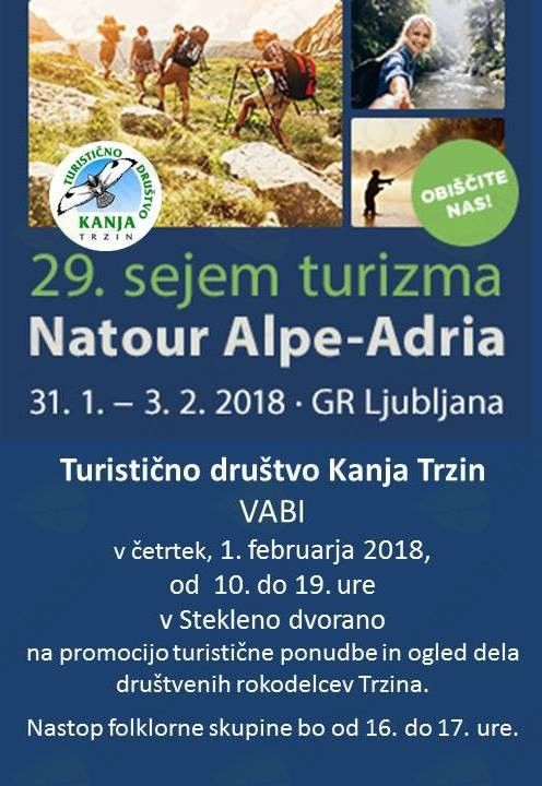 TD Kanja Trzin vabi v četrtek, 1. februarja 2018, od 10.00 do 19.00 ure v Stekleno dvorano (GR Ljubljana) na promocijo turistične ponudbe in ogled dela društvenih rokodelcev Trzina. Nastop folklorne skupine bo od 16.00 do 17.00 ure.