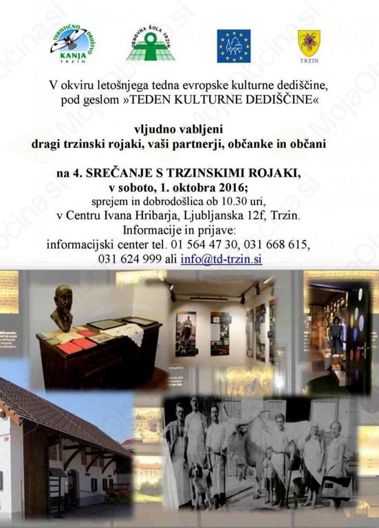 Vabljeni na 4. SREČANJE S TRZINSKIMI ROJAKI, ki bo v soboto, 1. oktobra 2016, s pričetkom ob 10.30 uri, v Centru Ivana Hribarja.