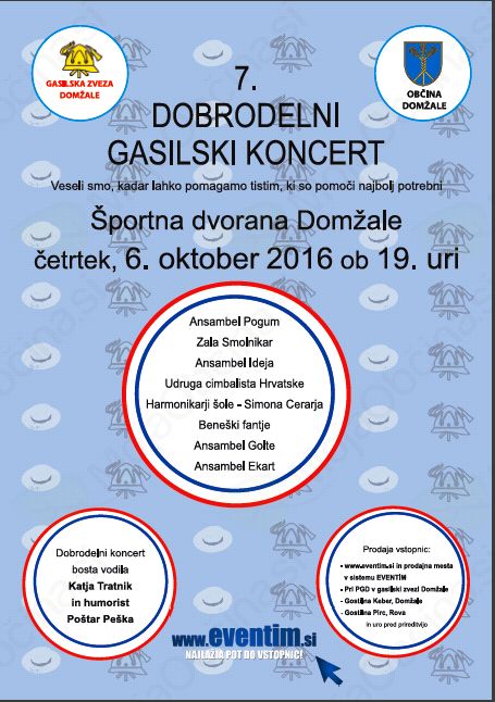 Vabljeni na 7. DOBRODELNI GASILSKI KONCERT, v Športno dvorano Domžale, 6.10.2016, ob 19:00 uri.