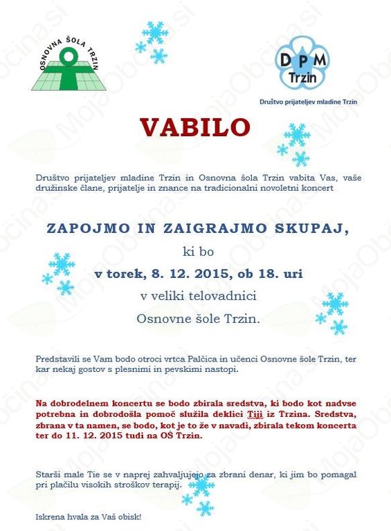 Na dobrodelnem koncertu se bodo zbirala sredstva, ki bodo kot nadvse potrebna in dobrodošla pomoč služila deklici Tiji iz Trzina. Sredstva, zbrana v ta namen, se bodo, kot je to že v navadi, zbirala tekom koncerta ter do 11. 12. 2015 tudi na OŠ Trzin.