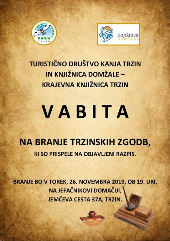 TD Kanja Trzin in Knjižnica Domžale - Krajevna Enota Trzin vabita na BRANJE TRZINSKIH ZGODB, ki so prispele na objavljeni razpis, v torek, 26. novembra 2019, ob 19. uri, na Jefačnikovi domačiji.