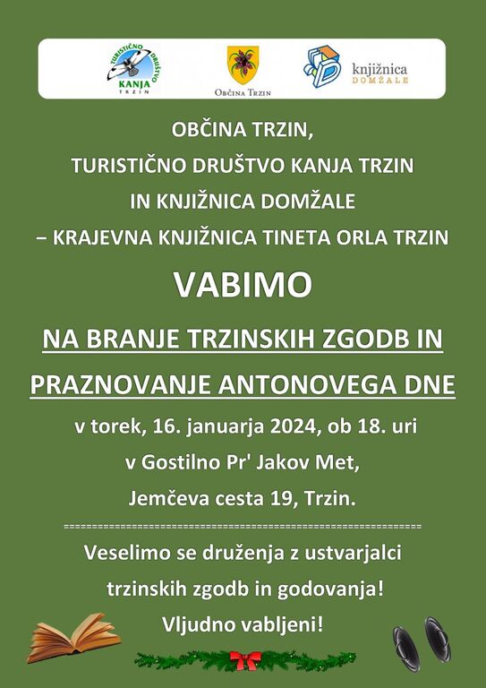 Občina Trzin, Turistično društvo Kanja Trzin in Knjižnica Domžale - Krajevna Knjižnica Tineta Orla Trzin vabijo na BRANJE TRZINSKIH ZGODB IN PRAZNOVANJE ANTONOVEGA DNE, ki bo v torek, 16. januarja 2024, ob 18. uri, v Gostilni Pr Jakov Met, Jemčeva cesta 19, Trzin.