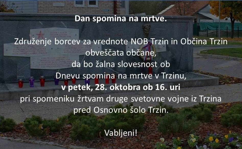 Združenje borcev za vrednote NOB Trzin in Občina Trzin obveščata, da bo žalna slovesnost ob Dnevu spomina na mrtve v Trzinu, v petek, 28.10.2016, ob 16.00 uri, pri spomeniku žrtvam druge svetovne vojne pred OŠ Trzin! Vabljeni!