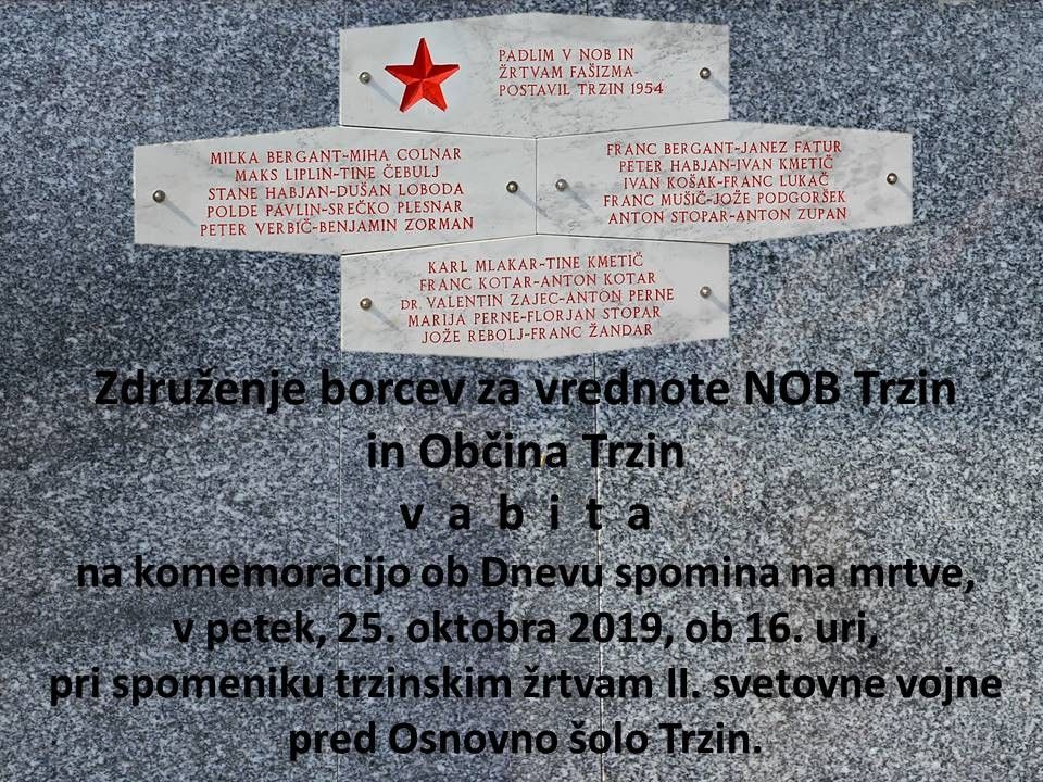Združenje borcev za vrednote NOB Trzin in Občina Trzin vabita na komemoracijo ob Dnevu spomina na mrtve, v petek, 25. oktobra 2019, ob 16. uri, pri spomeniku trzinskim žrtvam II. svetovne vojne pred Osnovno šolo v Trzinu.