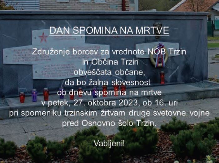 Združenje borcev za vrednote NOB Trzin in Občina Trzin obveščata občane, da bo žalna slovesnost ob dnevu spomina na mrtve v petek, 27. oktobra 2023, ob 16. uri pri spomeniku trzinskim žrtvam druge svetovne vojne pred Osnovno šolo Trzin.