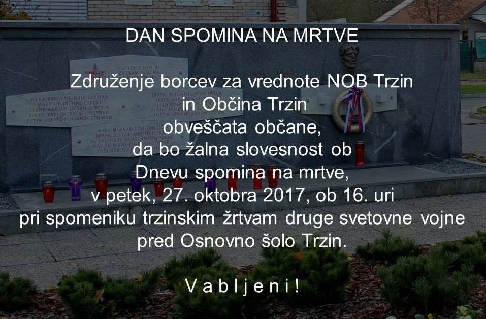 Združenje borcev za vrednote NOB Trzin in Občina Trzin vabita na žalno slovesnost ob Dnevu spomina na mrtve, v petek, 27. oktobra 2017, ob 16.00 uri, pri spomeniku pred OŠ Trzin.