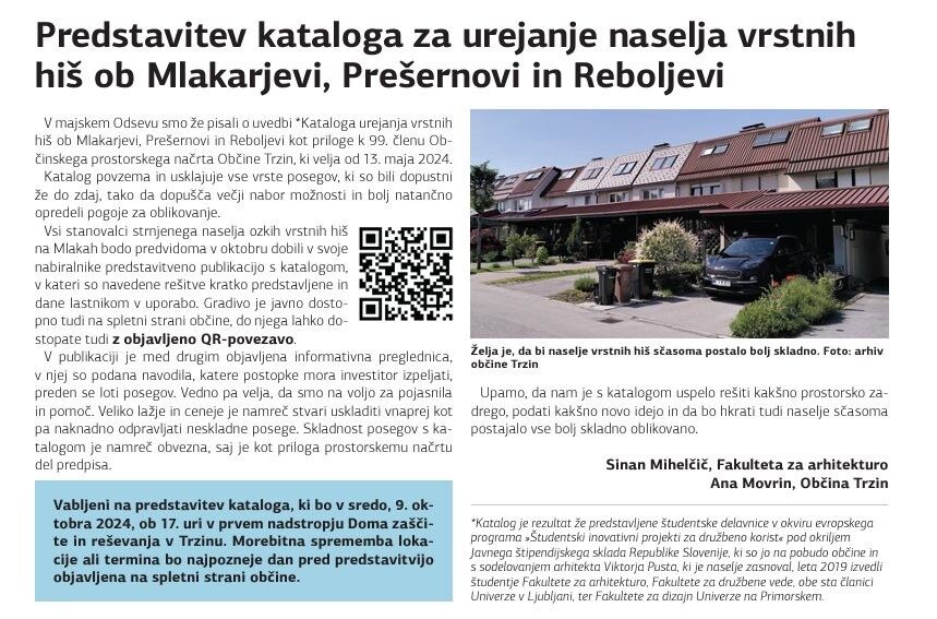 Vabljeni na Predstavitev kataloga za urejanje naselja vrstnih hiš ob Mlakarjevi, Prešernovi in Reboljevi, ki bo v sredo, 9. oktobra 2024, ob 17. uri, v prvem nadstropju Doma zaščite in reševanja v Trzinu.