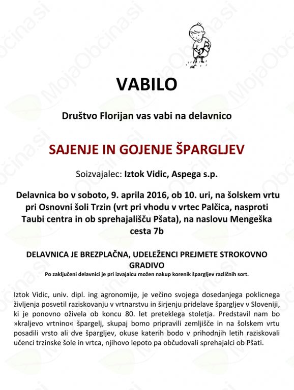 Društvo Florijan vabi na delavnico: SAJENJE IN GOJENJE ŠPARGLJEV. Delavnica bo v soboto, 9. aprila 2016, ob 10.00 uri, na šolskem vrtu pri OŠ Trzin, na Mengeški cesti 7b. Delavnica ja brezplačna!