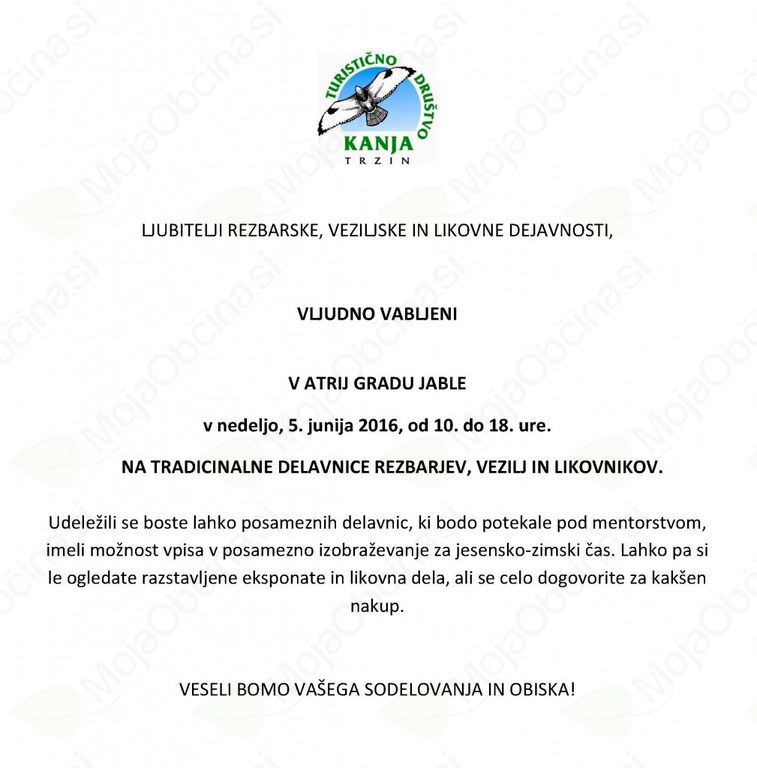 Vljudno vabljeni na tradicionalne delavnice rezbarjev, vezilj in likovnikov, v atrij gradu Jable, v nedeljo, 5. junija 2016, od 10.00 do 18.00 ure!