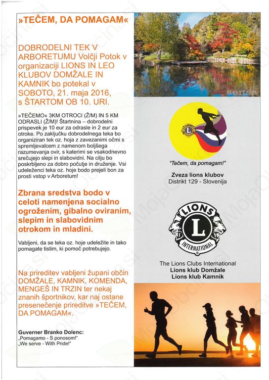 TEČEM, DA POMAGAM! Dobrodelni tek v Arboretumu Volčji Potok, v organizaciji Lions in Leo klubov Domžale in Kamnik, v soboto, 21. maja 2016, ob 10.00 uri.