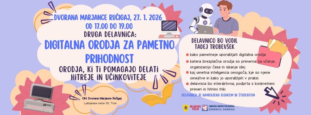 Druga delavnica: DIGITALNA ORODJA ZA PAMETNO PRIHODNOST, v torek, 27. januarja 2026, od 17. do 19. ure, v dvorani Marjance Ručigaj.