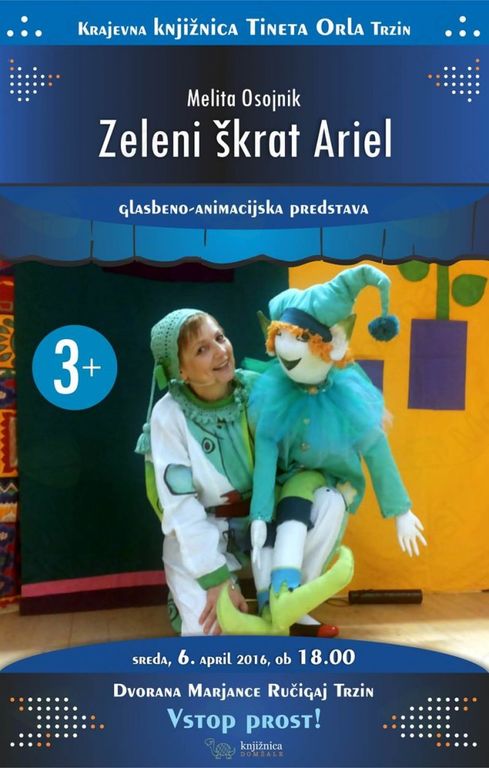 Krajevna Knjižnica Tineta Orla Trzin vabi na glasbeno-animacijsko predstavo ZELENI ŠKRAT ARIEL. Predstava bo v sredo, 6. aprila, 2016, ob 18.00 uri, v dvorani Marjance Ručigaj. Vstop prost!