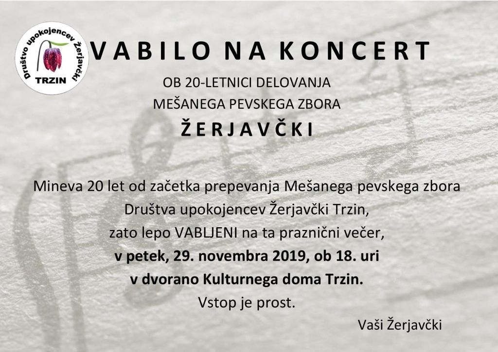 Koncert ob 20-letnici delovanja MEŠANEGA PEVSKEGA ZBORA ŽERJAVČKI, v petek, 29. novembra 2019, ob 18. uri, v dvorani Marjance Ručigaj.