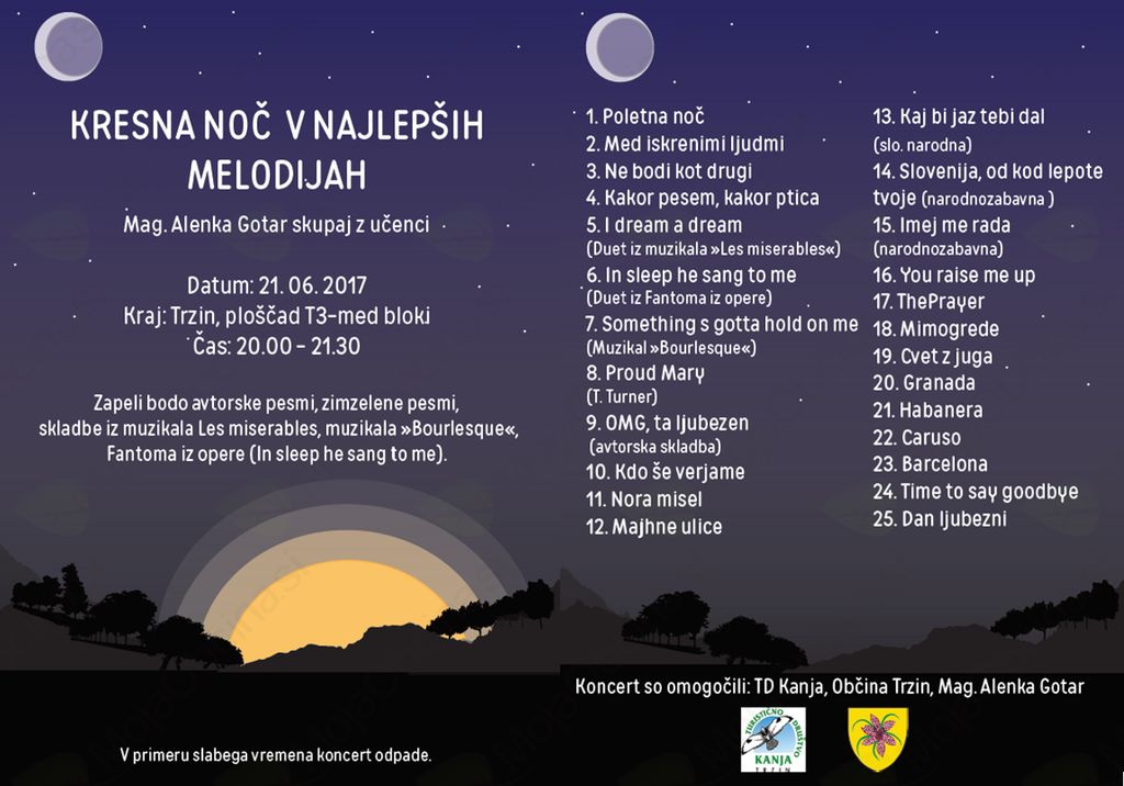 Kresna noč v najlepših melodijah, v sredo, 21. junija 2017, ob 20:00 uri, ploščad T3 - med bloki.