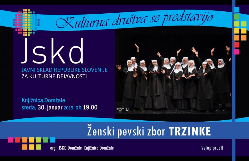 Javni sklad za kulturne dejavnosti Domžale in Knjižnica Domžale: Kulturna društva se predstavijo: Ženski pevski zbor Trzinke, v sredo, 30. januarja 2019, ob 19.00 uri, v Knjižnici Domžale.
