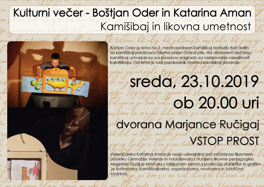 Kulturni večer Kamišibaj in likovna umetnost - gosta Boštjan Oder in Katarina Aman, v sredo, 23. oktobra 2019, ob 20. uri, v dvorani Marjance Ručigaj.