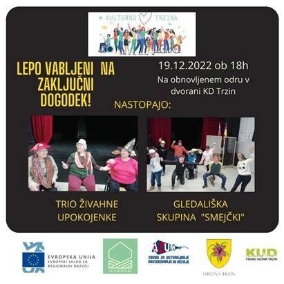 Kulturno srce Trzina - Lepo vabljeni na zaključni dogodek gledaliških skupin mladih z oviranostmi in upokojenk, ki bo v ponedeljek, 19. decembra 2022, ob 18. uri, na obnovljenem odru v dvorani Kulturnega doma Trzin.