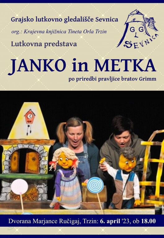 Krajevna Knjižnica Tineta Orla Trzin vabi na Lutkovno predstavo Grajskega lutkovnega gledališča Sevnica, z naslovom: JANKO in METKA. Predstava bo v četrtek, 6. aprila 2023, ob 18. uri, v dvorani Marjance Ručigaj.