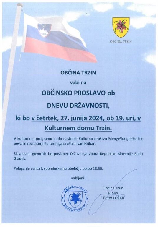 Občina Trzin vabi na OBČINSKO PROSLAVO OB DNEVU DRŽAVNOSTI, ki bo v četrtek, 27. junija 2024, ob 19. uri, v Kulturnem domu Trzin.