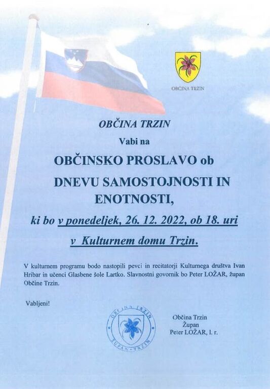 Občina Trzin vabi na OBČINSKO PROSLAVO OB DNEVU SAMOSTOJNOSTI IN ENOTNOSTI. Proslava bo v ponedeljek, 26. decembra 2022, ob 18. uri, v Kulturnem domu Trzin.