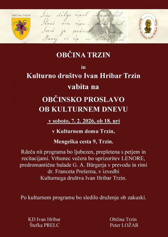 Občina Trzin in Kulturno društvo Ivan Hribar Trzin vabita na OBČINSKO PROSLAVO OB KULTURNEM DNEVU.