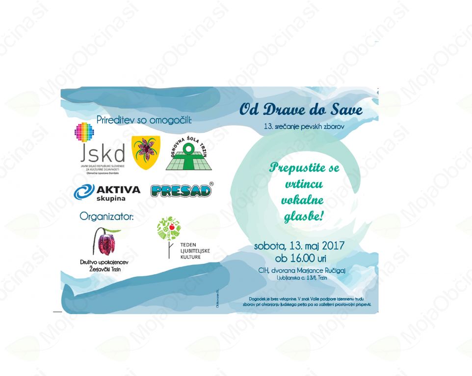Od Drave do Save: 13. srečanje pevskih zborov, v soboto, 13. maja 2017, ob 16.00 uri, v dvorani Marjance Ručigaj v Trzinu! Več informacij v prilogi!