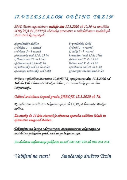 ODPOVEDANO!!! 17. VELESLALOM OBČINE TRZIN, v nedeljo 15. marca 2020, ob 10.30 uri, na smučišču SORIŠKA PLANINA.