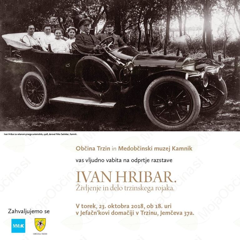 Občina Trzin in medobčinski muzej Kamnik vabita na odprtje razstave IVAN HRIBAR. Življenje in delo trzinskega rojaka, v torek, 23. oktobra 2018, ob 18. uri, v Jefačnkovi domačiji.