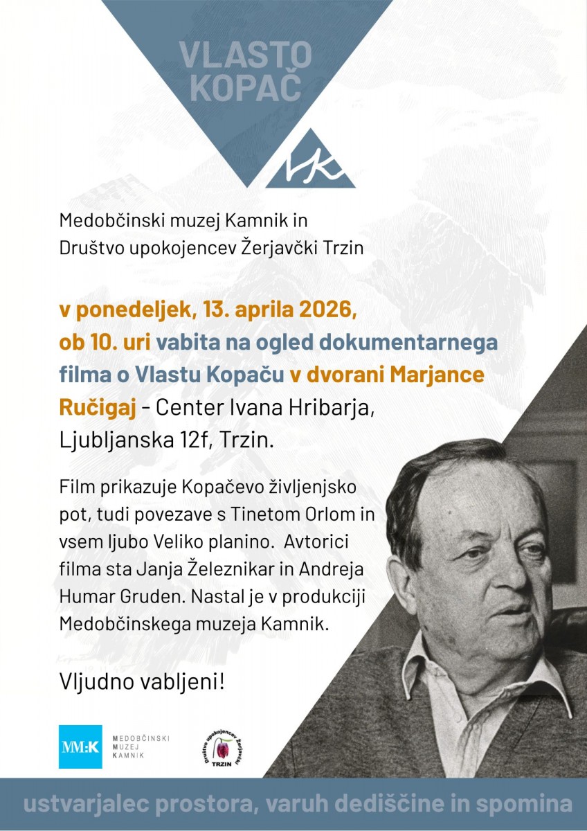 Medobčinski muzej Kamnik in Društvo upokojencev Žerjavčki Trzin v ponedeljek, 13. aprila 2026, ob 10. uri, vabita na OGLED DOKUMENTARNEGA FILMA O VLASTU KOPAČU v dvorani Marjance Ručigaj.