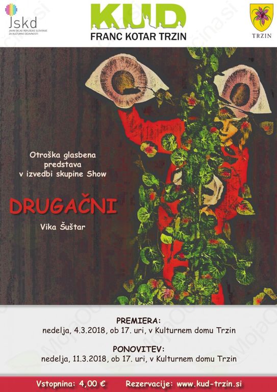 KUD Franc Kotar Trzin vabi na ogled otroške glasbene predstave v izvedbi trzinske gledališke skupine Show z naslovom DRUGAČNI, v nedeljo, 4. marca 2018, ob 17.00 uri - PREMIERA in v nedeljo, 11. marca 2018, ob 17.00 uri - ponovitev. Predstava bo potekala v Dvorani kulturnega doma v Trzinu!
