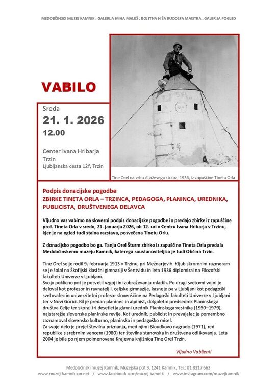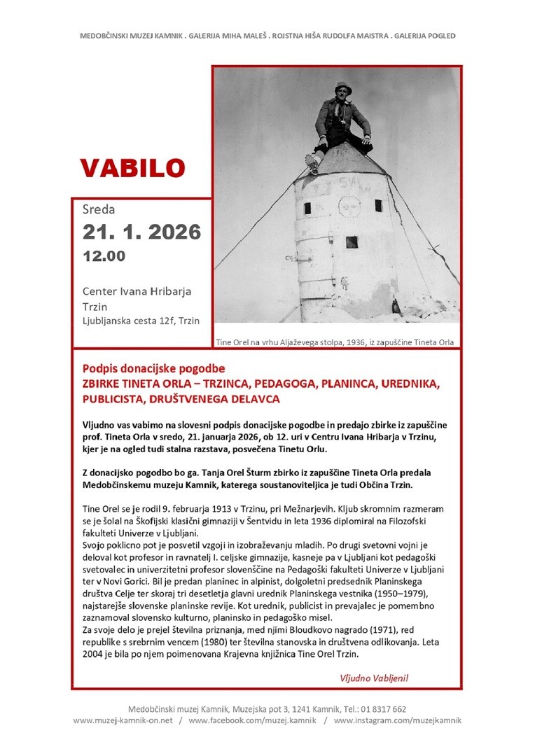 Podpis donacijske pogodbe in predaja zbirke iz zapuščine prof. Tineta Orla, v sredo, 21. januarja 2026, ob 12. uri v Centru Ivana Hribarja.