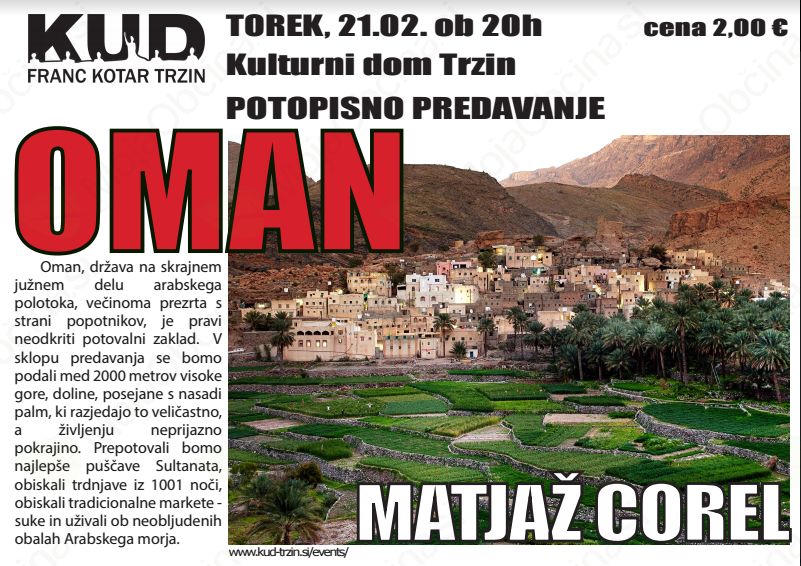 KUD Franc Kotar vabi na potopisno predavanje z naslovom OMAN, ki bo v torek, 21.02.2017, ob 20.00 uri, v dvorani Kulturnega doma. Predaval bo Matjaž Corel.