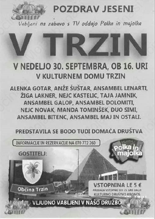 Pozdrav jeseni - zabava s TV oddajo Polka in majolka, v nedeljo, 30. septembra 2018, ob 16.00 uri, v Kulturnem domu Trzin.